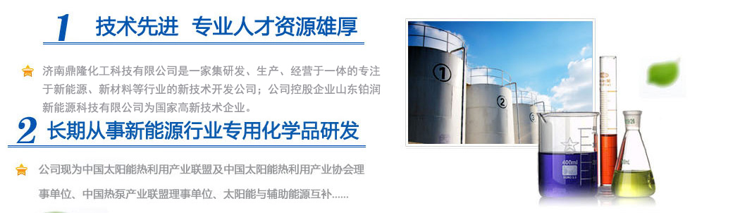 濟南鼎隆化工科技有限公司是一家集研發、生產、經營于一體的專注于新能源、新材料等行業的新技術開發公司;公司控股企業山東鉑潤新能源科技有限公司為國家高新技術企業。擁有雄厚的科研實力和專業銷售隊伍以及多名從事化學化工專業的高素質人員,其中博士生導師1人,碩士研究生3人。公司現為中國太陽能熱利用產業聯盟及中國太陽能熱利用產業協會理事單位、中國熱泵產業聯盟理事單位、山東清潔能源供暖產業聯盟理事單位、太陽能與輔助能源互補供熱/制冷工程專業委員會會員單位。公司專注于綠色科技,專業化研發環境友好型化工產品,與眾多高校和國內外多家著名化學品公司保持戰略合作關系。公司擁有“載能”和“澤能”...更多 |